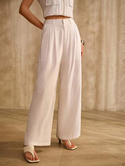 MOTF PREMIUM WOMEN'S WHITE FOLDED HEM LINEN BASIC ELEGANT OFFICE SUIT PANTS - White - View 1