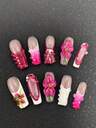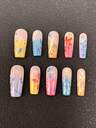 10 stycken rena handgjorda nagelpressningsnaglar 25 mm fyrkantiga naglar franska naglar tredimensionell modelleringslim snidningsteknik flerfärgad med söt och moderiktig design, lämplig för kvinnor att bära. Det finns tre storlekar att välja mellan, lämpliga för en mängd olika tillfällen, fester, danser och vardagskläder.