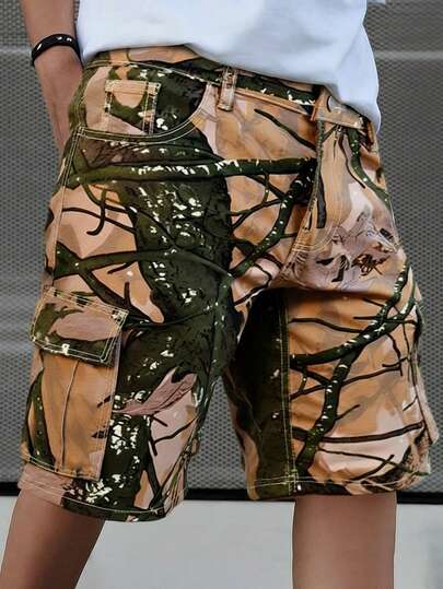 Manfinity EMRG Men's Branch Pattern Cargo Pocket Casual Denim Shorts Boyfriend & Husband Washed Loose Wide Leg For Vacation Cargo Denim Pants