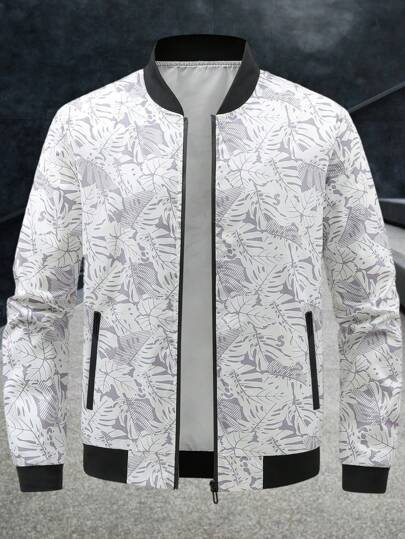 Manfinity Homme Men's Long Sleeve Vacation Tropical Plant Print Zip-Up Rave Bomber Jacket, Fall - Multicolor - View 1