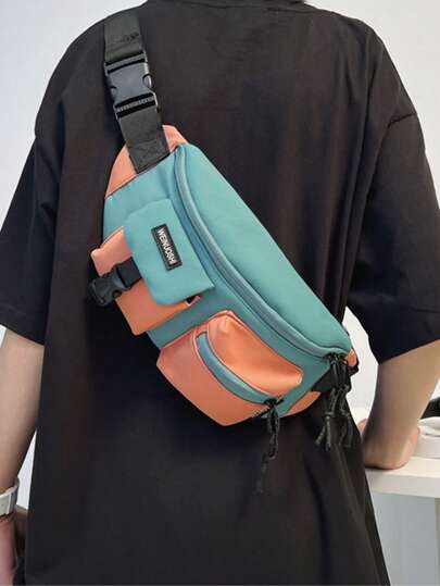 Medium Fanny Pack Colorblock Pocket Front Letter Patch Decor - Grön - Visa 1