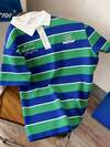 Manfinity Joysei Men's Retro College Style Blue & Green Striped Polo Shirt, Young & Fashionable, Suitable For Daily Wear