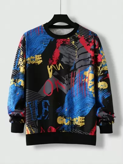 Herrtröja med graffititryck, för hösten, långärmad topp - Svart - Visa 1
