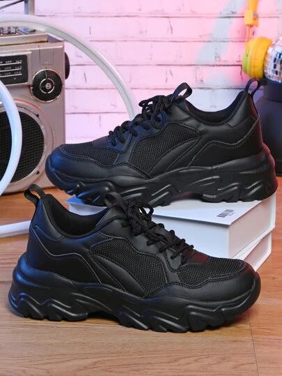 Men Lace-up Front Sneakers Black Chunky Shoes - Black - View 1