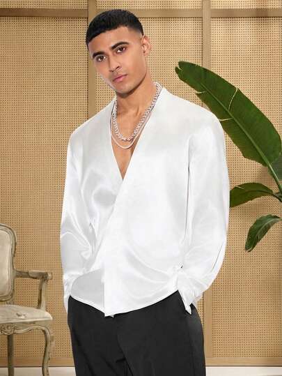 Men's Asymmetric Collar Woven Shirt, Elegant Party Style For Weddings, Music Festivals