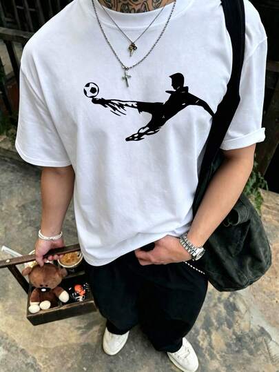 Men's Graphic T-Shirt, Soccer Silhouette Print, 100% Polyester Breathable Knit Fabric, Regular Fit Round Neck Design, Suitable For Summer Outdoor Sports And Everyday Wear