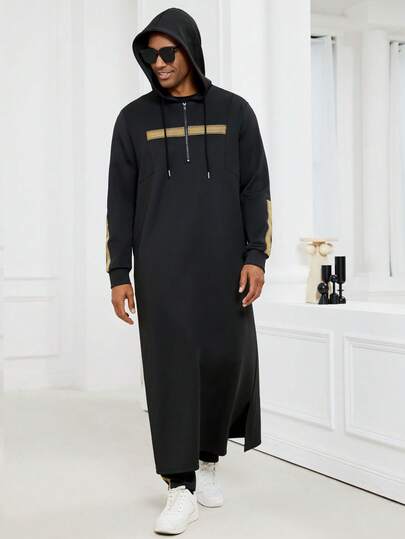 Herrmorgonrock med sidoslit i kaftan i bomull, lång klänning i bomull, modern islamisk lång thobe för män, islamisk lång klänning med huva för män, skarvad lågmäld gyllene väv, en elegant men ändå avslappnad design - Svart - Visa 1
