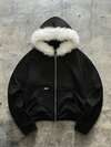 AXEPEAK American Style Black Fur Collar Hoodie, Niche Design Slim Fit Short Sweatshirt Jacket For Men