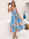 SHEIN LUNE Women's Tropical Plant Print V-Neck Ruffle Short Sleeve Long Elegant Dress With Side Slit Hem, Perfect For Vacation Maxi Women Outfit