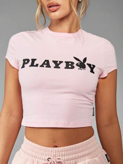 Missguided x Playboy Baby Crop T-shirt med logotyptryck Casual Sport Athleisure Lounge Atletisk Gym Modekläder Baby T-shirt Basics Kollektion - Dammrosa - Visa 1