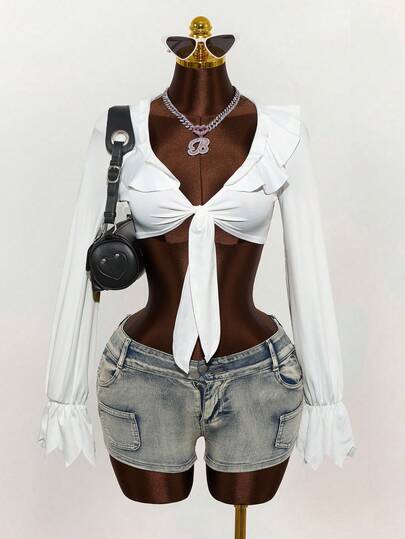 Mistrie Women's Fashion Sexy White Pleated Design Sleeve Bell Shirt - White - View 4