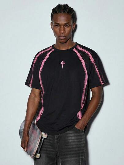 Modcrash Manfinity Streetrush Streetrush Men's Contrast Color Print Round Neck Short Sleeve T-Shirt Men Y2k Men Black,Halloween,Halloween Party,Streetwear , Retro American, Unisex, Relaxed Fit Summer Outfits – Suitable For Everyday Wear And Summer Holiday Outfits.