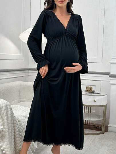 Moonlight&Mama Lace Patchwork Deep V-Neck Ruched Design Flare Sleeve Maternity Nightgown, For Fall, Winter - Black - View 1