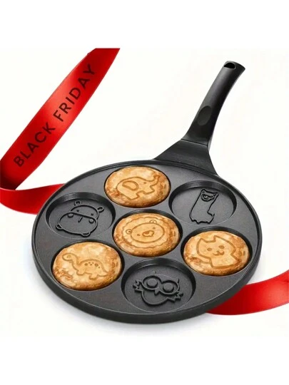 Multifunktionell aluminiumstekpanna med 7 söta tecknade formar - Lämplig för ägg, pannkakor och klimpar | Perfekt val för hemmakök och utomhuscamping - Svart - Visa 1