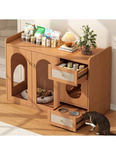 Multifunctional Cat Furniture 120x45x83 Cm, Combined Dining And Resting Area, Integrated Storage Without Accessories, Walnut Finish - Redwood - View 7