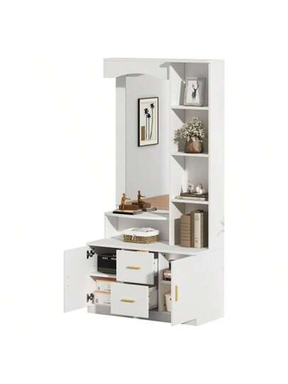Multifunctional Hall Furniture 90 X 40 X 180 Cm With Storage Space, Cabinets With Shoe Rack And Mirror, Wardrobe With 2 Drawers And 2 Built-In Wardrobes, Chest Of Drawers With Shelf, White - White - View 1