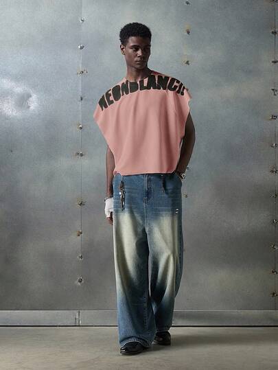 NEON BLANC Men's Street Style White Knitted Round Neck Letter Print Knit Tank Top, Suitable For Summer - Pink - View 1