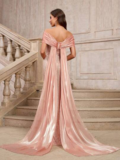 Ny paljett Off Shoulder Festklänning Dam Elegant sjöjungfru Lång tåg aftonklänning, vår/sommar - Champagne - Visa 1