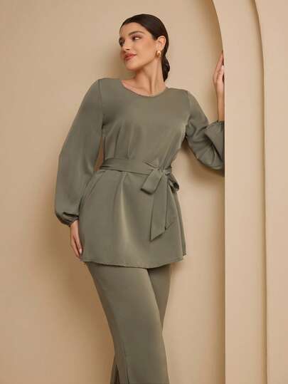 Graceveil 2st Kvinnors Casual Enfärgad Lös Top Och Vida Ben Byxor Set - Armé Grön - Visa 2
