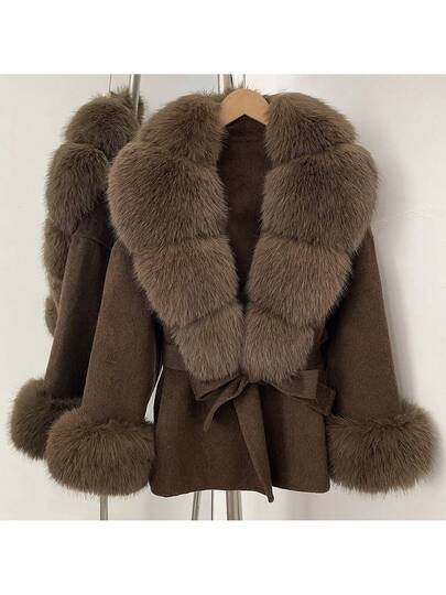 OFTBUY Enfärgad fuskpälskrage med bälte i ull, avslappnad gatustil för höst/vinter - Kaffebrun - Visa 1