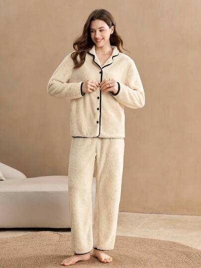 Old Money Damklänning med kontrastfärgade knappar framtill, långärmad topp och byxor, fluffig och mysig pyjamasset, Rapunzel Sleep, lurvig, varma höst-/vinterkläder - Aprikos - Visa 1