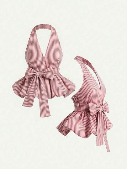 Olithes 2026 New Arrival Women's Wrap-Style Halter Top With Bow Tie Detail, Classic Striped Pattern - Versatile For Casual Daily, Office Commute, Relaxed Vacation Wear Pink Wrap Tops For Women Picnic Outfits For Women Summer Outfits For Women Halter Capri Brunch Outfits For Women 2 Piece Halter Tops For Women