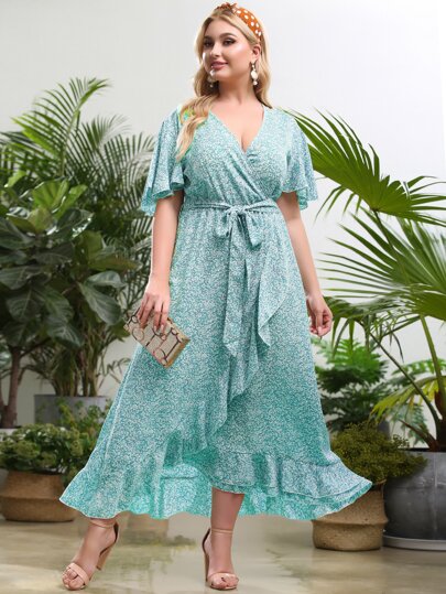 Plus Ditsy Floral Belted Ruffle Wrap A-line Dress - Mint Blue - View 1