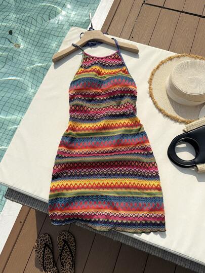 Solflare Plus Size Hollow Out Halter Backless Vacation Dress, Spring/Summer - Multicolor - View 1