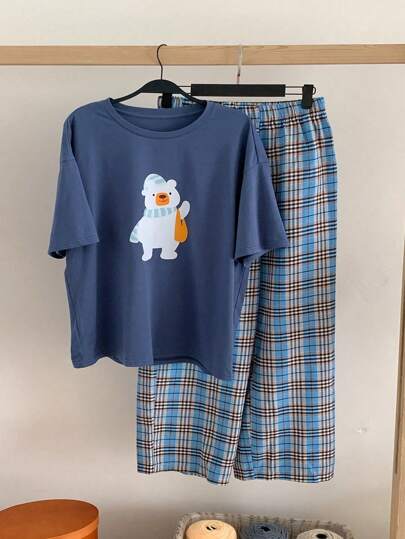 Dazy Plus Plus Size Women Cartoon Bear Print Top & Plaid Pants Pajamas Set, Home Outfit For All Seasons - Blue - View 1