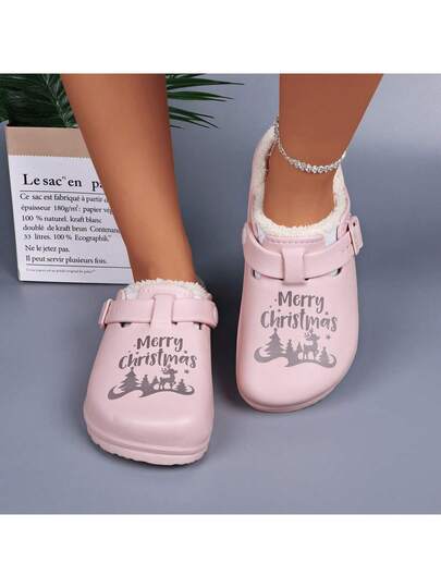 Plus Size Women's Christmas Pattern Slip-On Slippers, Adjustable Buckle, Warm Thermal Lined, Lightweight EVA, Anti-Slip, Comfortable Indoor Clogs - Pink - View 1