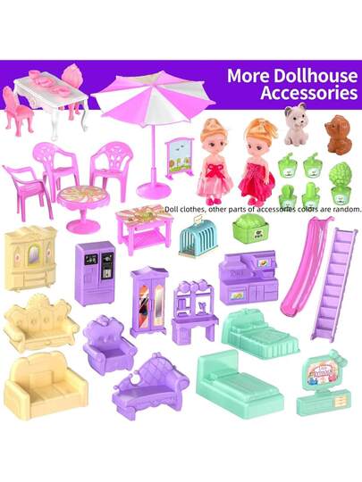Prinsessdockhus, 4-vånings dockhus med självlysande ljus, dockhuslekset med 2 dockor, 12 lekområden, kompletta möbler och tillbehör, leksaker för 3 4 5 6 7 8 9-åriga flickor, present, lila - Multifärgad - Visa 6