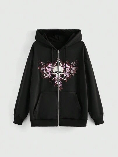 ROMWE Grunge Punk Hoodiejacka med dragkedja i skallmönster - Svart - Visa 1