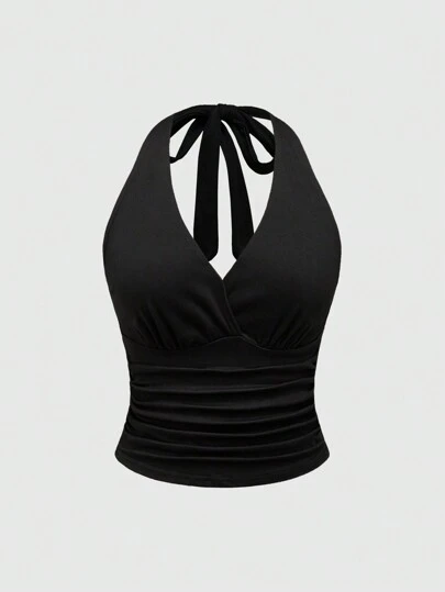 ROMWE Grunge Punk Y2K Tie Back Solid Black Halter Top för kvinnor - Svart - Visa 1