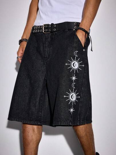 ROMWE MEN Street Life Men's Star & Moon Embroidery Pocket Loose Casual Denim Shorts - Black - View 1