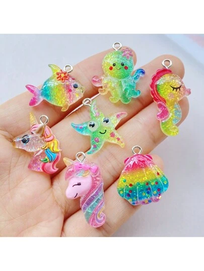 Resin Ocean Series Charms Bulk Pack - 7pcs Cute Cartoon Shiny Octopus, Seahorse, Small Fish, Starfish, Shells, Colorful Unicorn Pendants For DIY Jewelry, Scrapbooking Crafts - Mixed - View 1
