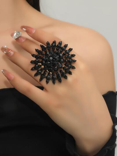 Rhinestone Flower Decor Ring - Gun Black - View 1