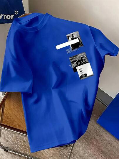 Round Neck Architectural Print Teen Boys Fashionable Summer Short-Sleeved Sports T-Shirt, Comfortable And Versatile, Suitable For Summer And Spring - Blue - View 1