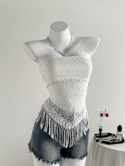 Roylia Stickad topp med tofsar och skör spets för kvinnor - Vitt - Visa 1