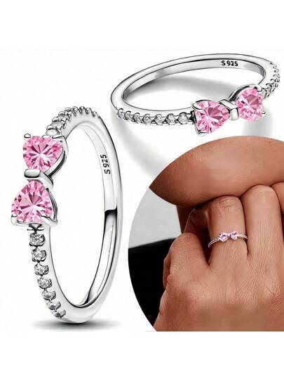 S925 Silverring Zirkoniumoxid Skinande Rosa Rosettring Original S925 Fingervigselring Gör-det-själv Kvinnors Fina Smycken Gåva - Rosa hjärtring - Visa 6