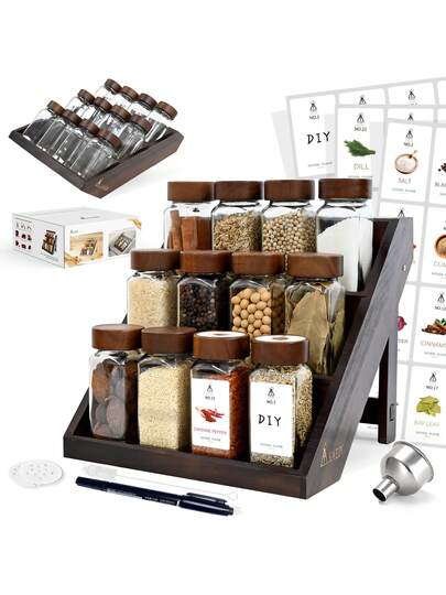 SAEIV Square Spice Jars, 2-In-1 Design With Acacia Wood Stand (FCM®) – Set Of 12 Spice Jars (120 Ml Each), Including Multiple Labels, Can Be Stood Upright And Is Suitable For Drawers – Spice Rack For Drawers And Spice Jars - Set Of 12 Square Bottles With Acacia Wood Stand - View 1