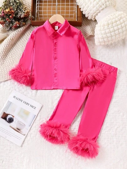 SHEIN 2pcs/Set Young Girl Elegant Satin Fabric Long Sleeve Shirt With Fluffy Cuff And Fluffy Trim Pants, Suitable For Spring, Autumn And Winter - Hot Pink - View 1