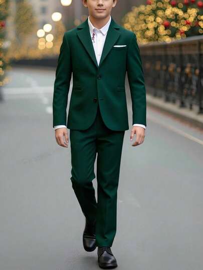 SHEIN 2pcs Tween Boy Casual Preppy Gentleman Outfit, Solid Color Blazer Jacket And Elastic Waist Formal Pants Set, Suitable For Birthday Party, Formal Occasion, Wedding