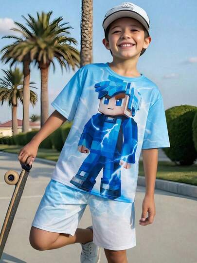2pcs Tween Boy Street Style Casual Funny 3D Pattern Short Sleeve Crew Neck T-Shirt And Elastic Waist Shorts Set, Suitable For Autumn, Spring, Summer, Outdoor Play, School, Street Style, Party And Leisure