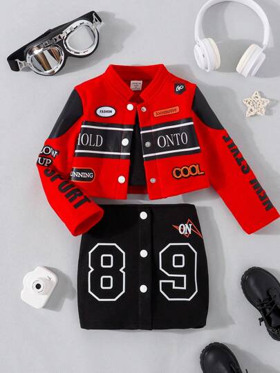 SHEIN 3st Young Girl Cool Motorcykel Tryckt Set, Höst/Vinter - Röd - Visa 1
