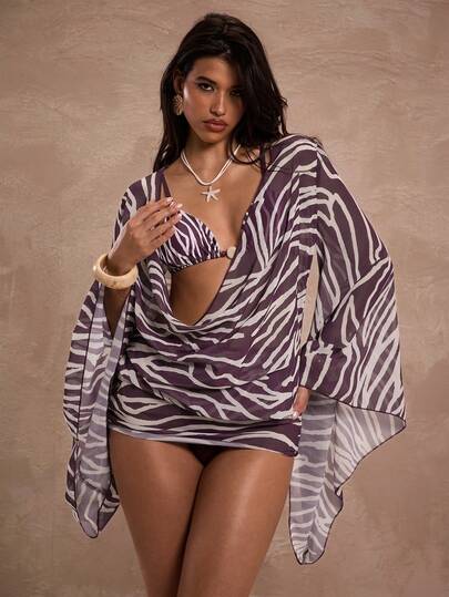 SHEIN BAE Damklänning med zebramönster och draperad halsringning och utsvängda ärmar för semestern - Multifärgad - Visa 1