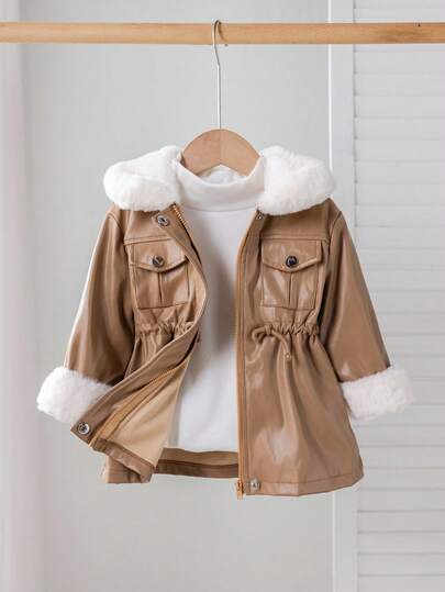 SHEIN Baby Girl Khaki Casual Thermal Lined Turndown Collar Jacket, Autumn/Winter - Khaki - View 1