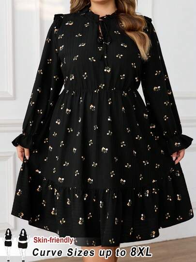 SHEIN CURVE+ Plus Size Women's Printed Casual Belt Lace Up Dress - Multicolor - View 1