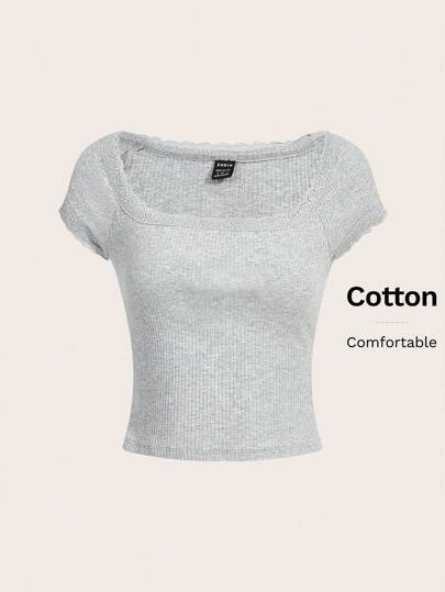 SHEIN EZwear Summer Raglan Sleeves Lace Trim Rib-Knit Tee - Grey - View 1