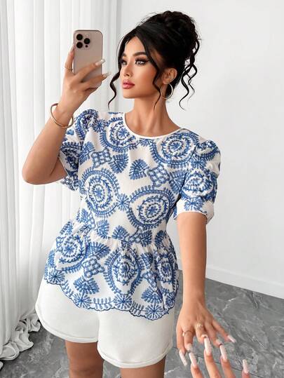 SHEIN Elenzya Plus Size Elegant Embroidered Design Shirt, Summer - Multicolor - View 1