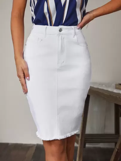 SHEIN Essnce High Waist Raw Hem Denim Skirt - White - View 1